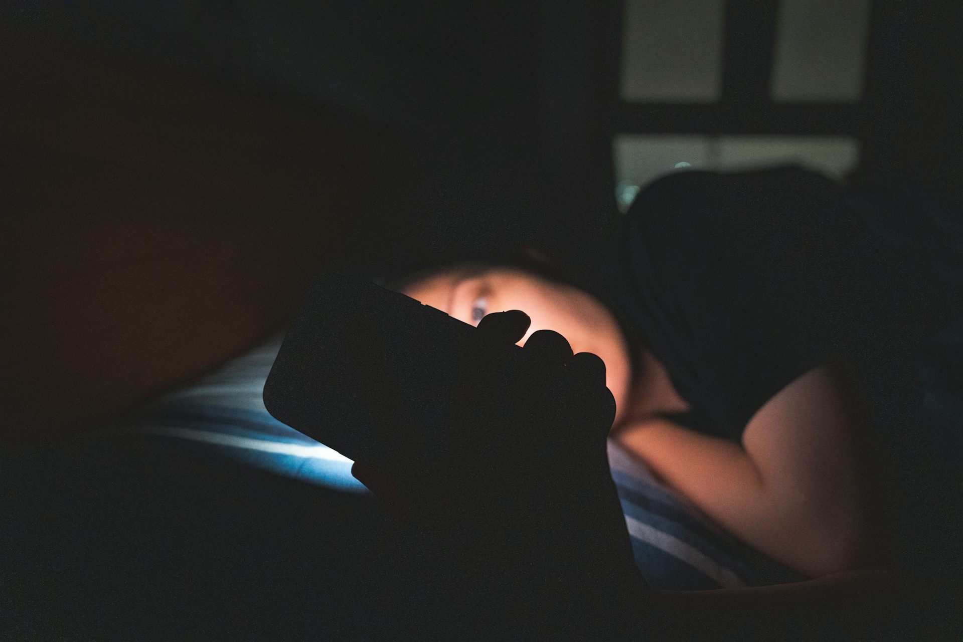 A woman staring at her cellphone while lying in the dark.